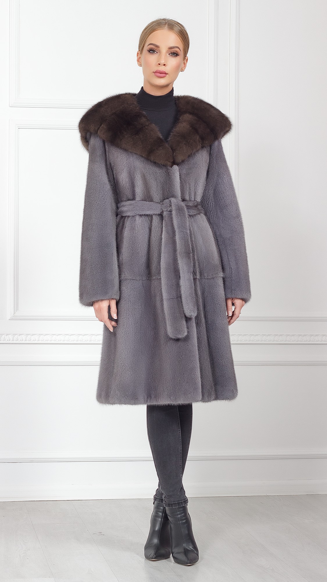 Шуба из меха норки, отделка куница